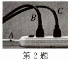 2. 如图为家用插线板,A线接入家庭电路中,B线接手机,C线接电脑,手机和电脑的连接方式是____;两个用电器在充电过程中,A、B两处电流的大小关系为$I_{A}$____$I_{B}$。