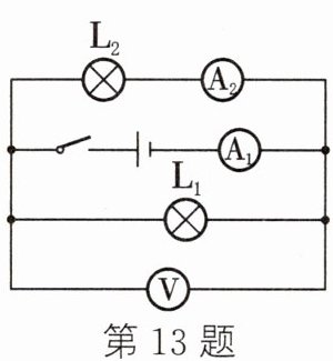 13. (2024·泰安)如图所示电路,电源电压保持不变。闭合开关后,电路中各元件正常工作,两个相同的电流表(均有$0\sim 0.6A和0\sim 3A$两个量程)指针偏转的角度相同。一段时间后电流表$A_{1}指针偏转的角度突然变为原来的\frac{1}{5}$,若灯$L_{1}和L_{2}$出现了断路故障,其他元件均完好。针对故障电路的观察分析,下列说法正确的是()