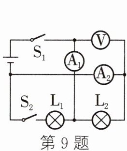9. 如图所示,当开关$S_{1}$、$S_{2}$都闭合时,电压表示数为$5V$,电流表$A_{1}的示数为0.5A$,电流表$A_{2}的示数为0.3A$,则通过$L_{1}$的电流为______$A$,电源电压是______$V$。