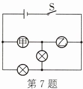 7. 如图所示的电路中,闭合开关$S$后,两灯均发光,则甲是______表,乙是______表。