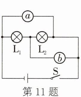 11. 如图所示的电路中,$a$、$b$为同种电表(电流表或电压表)。闭合$S$,灯$L_{1}$、$L_{2}$均发光,则下列说法正确的是()