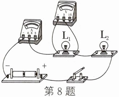 8. 如图所示,闭合开关,因单个灯泡有故障,电流表示数为零,两个灯都不亮。测出灯泡$L_{1}两端电压为3V$,电路发生的故障是______;如果电压表示数为零,电路发生的故障可能是______。
