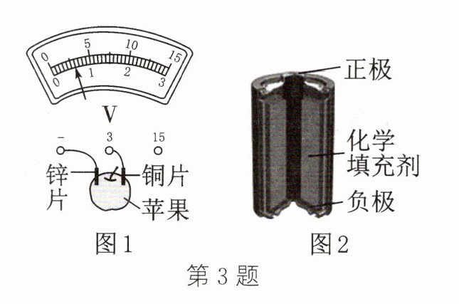 3. 项目化学习小组提出影响水果电池电压的因素,利用铜片、锌片作电极的水果电池(图1)和电压传感器(精密电压测量仪)等器材进行实验。数据记录如下表: