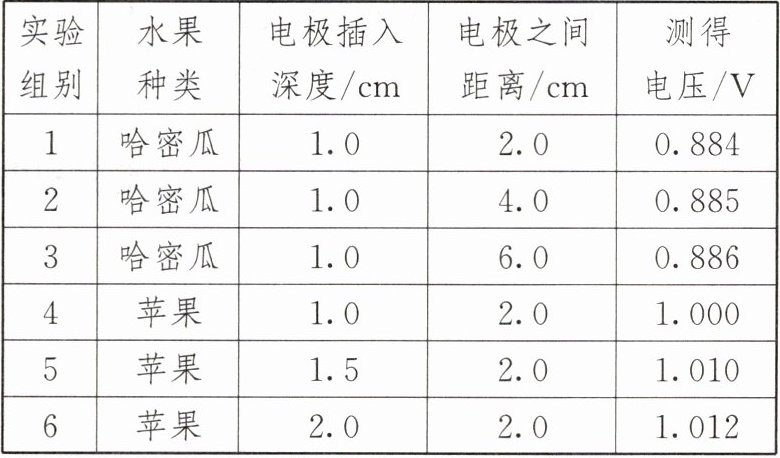 (2)为探究电极之间距离对水果电池电压大小的影响,应选用实验____(填组别)进行对比。