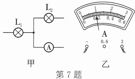 7. 如图甲是电路图中的一部分,已知通过灯泡$L_{1}$的电流为0.6A,通过$L_{2}$的电流为0.4A,电流表的示数如图乙所示,则下列判断正确的是()