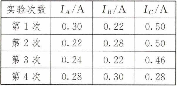 (2) 该小组同学换用不同规格的小灯泡进行实验,用电流表多次测A、B、C三点电流,记录实验数据如右表。分析表中数据,以下说法不合理的是______。