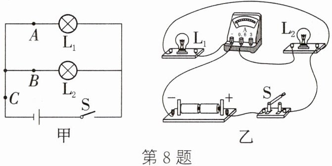 8. (2024·成都)在“探究并联电路中的电流特点”实验中,图甲是某小组同学设计的电路图。