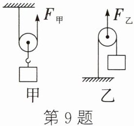 9. 如图所示,小明组装了甲、乙两种滑轮,用来提升同一物体,$G_{物}= 200N$(不计绳重、轮重和摩擦),要使物体竖直匀速提升2m。下列说法中正确的是()