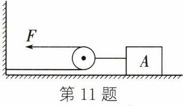 11. 如图所示,物体A的质量为50kg,当力F为100N时,物体A恰能匀速前进,若A前进0.5m所用的时间为10s(不计绳和滑轮的重力以及它们之间的摩擦,g取10N/kg)。求: