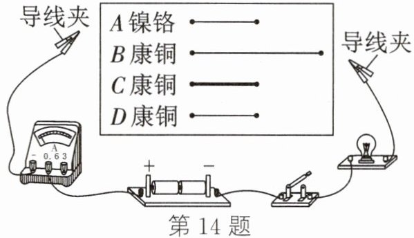 14. 小明用如图所示实验装置比较镍铬丝与康铜丝电阻的大小,木板上安装有A、B、C、D四根金属丝(其中A、C、D长度相同,C的横截面积是其余金属丝的两倍)。他将选用的金属丝分别接入图中电路进行实验(电源两端电压不变)。请回答下列问题: