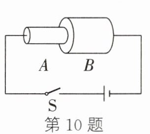 10. 如图,长度相同的镍铬合金丝A比镍铬合金丝B细得多,如果镍铬合金丝A和B的电阻分别为$R_{A}和R_{B}$,则有$R_{A}$____$R_{B}$;镍铬合金丝A和B连入电路,闭合开关S,此时通过它们的电流分别为$I_{A}和I_{B}$,则有$I_{A}$____$I_{B}$。($\gt / = / \lt $)