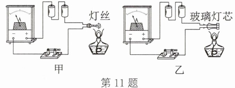 11. 如图所示,分别加热甲、乙两图中的灯丝和玻璃灯芯,两个电表的读数将会分别()