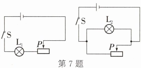 7. 如图所示的两个电路中,电源电压相等且保持不变,闭合开关S,当滑动变阻器的滑片P都向右移动时,灯泡$L_1$和$L_2$的亮度变化情况是()