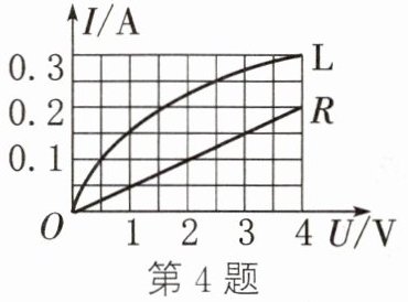 4. 如图所示是灯L和电阻R的电流随电压变化的图像,电阻R的阻值为____Ω。若将它们串联接在电路中,电流为0.2A,则灯L的电阻为____Ω。