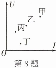 8. 某同学用伏安法对四个电阻各测量一次,把每个电阻两端的电压和通过它的电流在U-I坐标系中描点,得到了图中甲、乙、丙、丁四个点。比较这四个电阻的大小,可知电阻值最大的是()