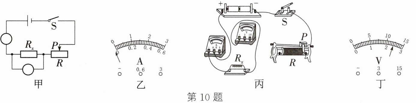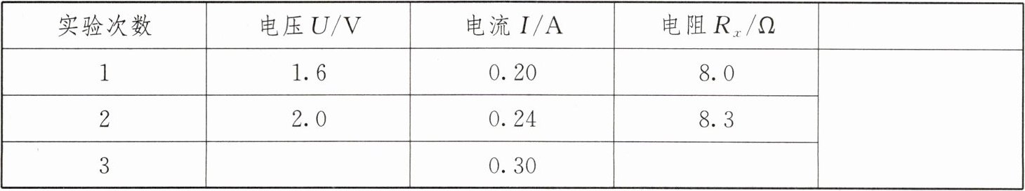 (4)测得的部分数据已记录在表格中,表格中第一行的最后空格栏内应填写的内容是____。在第3次测量时,电压表的示数如图丁所示,根据这三次测得的数据,$R_{x}$阻值的平均值为____Ω。