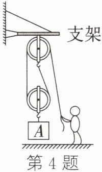 4. 如图所示,滑轮组悬挂在水平支架上,某工人站在水平地面上,竖直向下拉动绳子自由端,使物体A以10cm/s的速度匀速上升,已知物体A重480N,每个滑轮重120N,工人重600N;不计滑轮组的绳重和摩擦,下列说法中正确的是()
