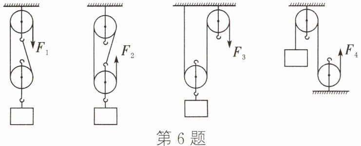 6. 用如图所示的滑轮组,匀速提起重力为G的重物(绳重、动滑轮重和摩擦均不计),则动力F与重力G的关系是:$F_1= ____,F_2= ____,F_3= ____,F_4=$