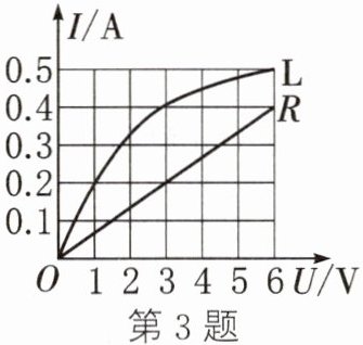 3. (2024·黑龙江)如图为灯泡L和定值电阻R的$I-U$图像,若将L和R并联在电源电压为3V的电路中,干路电流为______A;若将其串联在电源电压为4V的电路中,L和R的阻值之比为______。