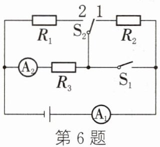 6. (2024·江西)如图所示,三个电阻$R_{1}$、$R_{2}$、$R_{3}$的阻值均相同,开关$S_{1}$断开、$S_{2}$掷到1,电流表$A_{1}与A_{2}$的示数之比为______;当开关$S_{1}$闭合、$S_{2}$掷到2时,电流表$A_{1}与A_{2}$的示数之比为______。