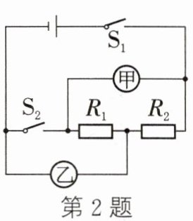 2. (2024·南充)如图所示电路,若甲、乙两表为电流表,闭合开关$S_{1}$,断开开关$S_{2}$,两表指针位置相同,则$R_{1}:R_{2}= $______;若甲、乙两表为电压表,闭合开关$S_{1}$、$S_{2}$,则两表示数之比是______(电表每次测量均未超过量程)。