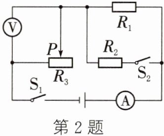 2. 如图所示电路,电阻$R_{1}= 10Ω$,当开关$S_{1}$闭合,$S_{2}$断开,滑动变阻器的滑片P移到最右端时,电压表示数为6V,电流表示数为0.3A;当开关$S_{1}$、$S_{2}$都闭合,滑片P移到最左端时,电流表示数为1.5A。求: