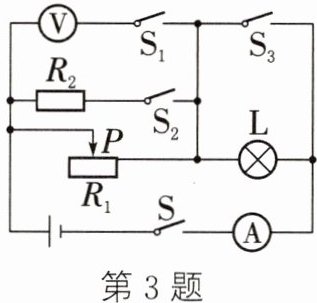 3. 如图所示的电路中,电源电压不变,小灯泡L的规格为“3V 0.25A”(小灯泡正常发光时两端的电压为3V,电流为0.25A),且忽略温度对灯丝电阻的影响,定值电阻$R_{2}= 15Ω$。