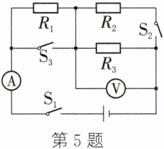5. 如图所示,电源电压恒为9V,$R_{1}= 20Ω$,$R_{2}= 30Ω$。只闭合开关$S_{1}$,电压表示数为6V。求: