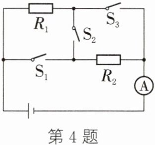 4. 如图所示的电路中,电源电压不变,电阻$R_{1}$的阻值为20Ω,当断开开关$S_{1}和S_{2}$,闭合开关$S_{3}$时,电流表的示数为0.6A;当断开开关$S_{2}$,闭合开关$S_{1}$、$S_{3}$时,电流表的示数为0.9A。求: