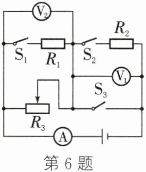 6. 如图所示,电源电压恒定不变。滑动变阻器$R_{3}$的滑片位于最右端,$S_{1}$、$S_{2}$断开,$S_{3}$闭合时,电压表$V_{2}$的示数为12V。