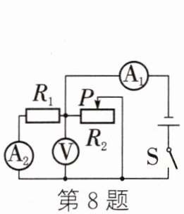 8. 如图所示,电源电压不变,闭合开关S,若将滑片P向右移动,电压表V的示数将____,电流表$A_{1}$的示数将____,电流表$A_{2}$的示数将____。(变大/不变/变小)