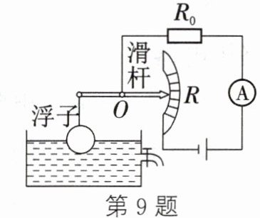 9. (2024·武汉)如图所示是一种测定油箱内油量的装置。其中R是滑动变阻器的电阻片,杠杆的右端是滑动变阻器的滑片,杠杆左端固定着一个浮子,油箱内油量变化时,滑片就在电阻片R两端之间滑动。下列说法错误的是()