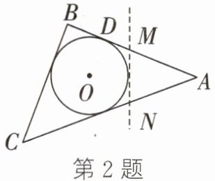 2. 如图,△ABC是一张周长为17cm的三角形的纸片,BC= 5cm,⊙O是它的内切圆,小明准备用剪刀在⊙O的右侧沿着与⊙O相切的任意一条直线MN剪下△AMN,则剪下的三角形的周长为(