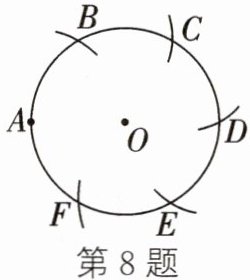 8. 尺规作图特有的魅力曾使无数人沉湎其中,连当年叱咤风云的拿破仑也不例外.我们可以只用圆规将圆等分,例如可将圆六等分.如图,只需在$\odot O$上任取点A,从点A开始,以$\odot O$的半径为半径,在$\odot O$上依次截取点B、C、D、E、F.从而点A、B、C、D、E、F把$\odot O$六等分.下列四种等分:① 两等分;② 三等分;③ 四等分;④ 五等分.其中可以只用圆规等分的是 (