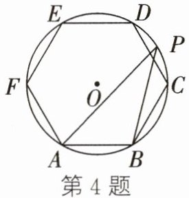 4. 如图,正六边形ABCDEF内接于$\odot O$,点P是$\overset{\frown}{CD}$上的任意一点,则$∠APB$的大小是