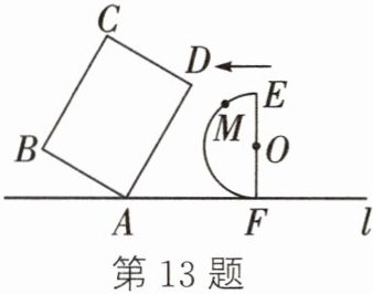 13. 如图,在矩形ABCD中,$AB = 6$,$BC = 8$,点A在直线l上,AD与直线l相交所得的锐角为60°.点F在直线l上,$AF = 8$,$EF \perp$直线l,垂足为F,且$EF = 6$,以EF为直径,在EF的左侧作半圆O,点M是半圆O上任一点.