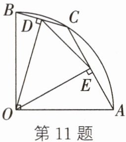 11. 如图,在扇形OAB中,$\angle AOB = 90^{\circ}$,C是$\overset{\frown}{AB}$上的一个动点(不与点A、B重合),$OD \perp BC$,$OE \perp AC$,垂足分别为D、E.若$DE = 1$,则扇形OAB的面积为______