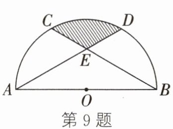 9. 如图,AB是半圆O的直径,点C、D在半圆O上,$\overset{\frown}{AC} = \overset{\frown}{CD} = \overset{\frown}{BD}$,AD、BC相交于点E,若$AB = 4\sqrt{3}$,则$\overset{\frown}{CD}$、CE、DE围成的图形的阴影面积为(