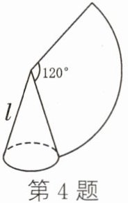 4. 如图,圆锥的侧面展开图是一个圆心角为$120^{\circ}$的扇形,若圆锥的底面圆半径是$\sqrt{5}$,则圆锥的母线$l= $