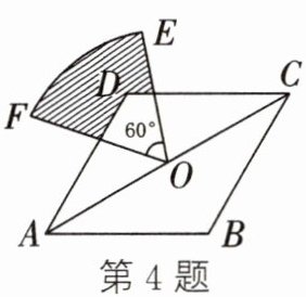 4. (2024·日照)如图,在菱形 $ ABCD $ 中,$ AB = 2 $,$ \angle B = 120^{\circ} $,点 $ O $ 是对角线 $ AC $ 的中点,以点 $ O $ 为圆心,$ OA $ 长为半径作圆心角为 $ 60^{\circ} $的扇形 $ OEF $,点 $ D $ 在扇形 $ OEF $ 内,则图中阴影部分的面积为 (