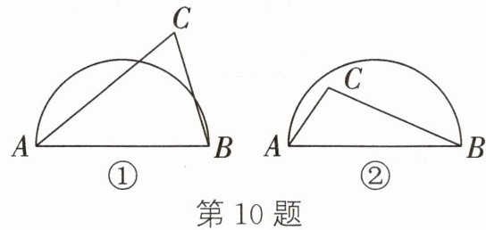 10. 如图,AB是半圆的直径,图①中,点C在半圆外,图②中,点C在半圆内,请仅用无刻度的直尺: