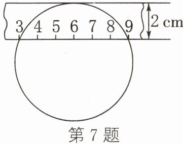 7. 如图,一把宽为2 cm的刻度尺(刻度单位:cm)放在圆形玻璃杯的杯口上,刻度尺的一边与杯口外沿相切,另一边与杯口外沿两个交点处的读数恰好是3和9,那么玻璃杯的杯口外沿半径为