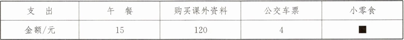 9. 假期,小华带150元去图书馆,下表记录了他当天的所有支出,其中小零食支出的金额不小心被涂黑了,如果平均每包小零食的售价为5元,那么小华可能剩下的金额是 (