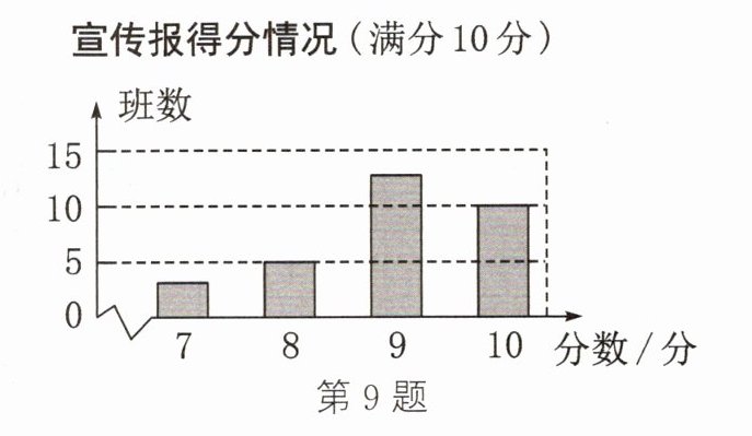 9. (2024·河南)2024年3月是第8个全国近视防控宣传教育月,其主题是“有效减少近视发生,共同守护光明未来”.某校组织各班围绕这个主题开展板报宣传活动,并对各班的宣传板报进行评分,得分情况如图所示,则得分的众数为______分.