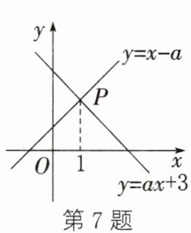 7. 如图,函数 $ y = x - a $ 和 $ y = ax + 3 $ 的图象交于点 $ P $,点 $ P $ 的横坐标为 $ 1 $,则关于 $ x、y $ 的方程组 $ \begin{cases} y = x - a, \\ y = ax + 3 \end{cases} $ 的解是(