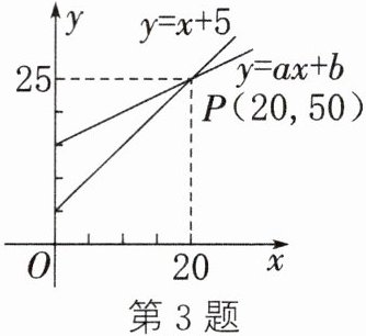 3. 数形结合是解决数学问题常用的思想方法,如图,直线 $ y = x + 5 $ 和直线 $ y = ax + b $ 相交于点 $ P $,根据图象可知,方程组 $ \begin{cases} x - y + 5 = 0, \\ ax - y + b = 0 \end{cases} $ 的解是
