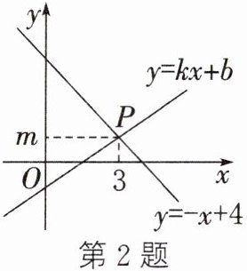 2. 如图,一次函数 $ y = kx + b $ 与 $ y = -x + 4 $ 的图象相交于点 $ P(3, m) $,则关于 $ x、y $ 的二元一次方程组 $ \begin{cases} x + y = 4, \\ kx - y + b = 0 \end{cases} $ 的解是(
