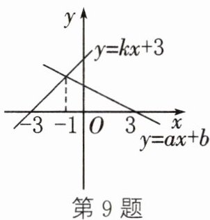 9. 如图,根据函数图象回答问题:方程组 $ \begin{cases} y = kx + 3, \\ y = ax + b \end{cases} $ 的解为