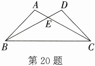20.如图,已知$\angle A= \angle D$,有下列五个条件:① $AE = DE$;② $BE = CE$;③ $AB = DC$;④ $\angle ABC= \angle DCB$;⑤ $AC = BD$。能证明$\triangle ABC与\triangle DCB$全等的条件有几个?并选择其中一个进行证明。