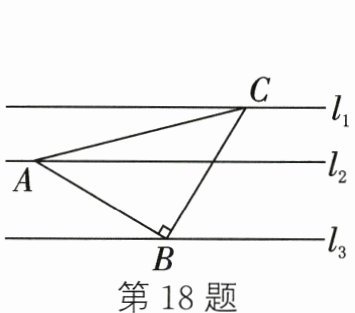 18. 如图,已知$\triangle ABC$中,$∠ABC= 90^{\circ}$,$AB= BC= \sqrt{13}$,三角形的顶点在相互平行的三条直线$l_{1}$、$l_{2}$、$l_{3}$上,且$l_{2}$、$l_{3}$之间的距离为2,则$l_{1}$、$l_{2}$之间的距离为______